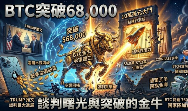 現況:晚間 19:26,BTC 成功突破 68,000 美元,截稿前報 $68,120。