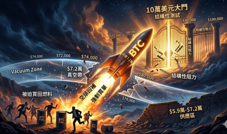 解讀:目前進入 $72,000 至 $82,000 的「真空地帶」。根據 URPD(鏈上籌碼分佈),這段區間歷史交易量極低,意味著技術阻力微弱。只要現貨需求持續,價格極易出現「跳空式」的上漲。